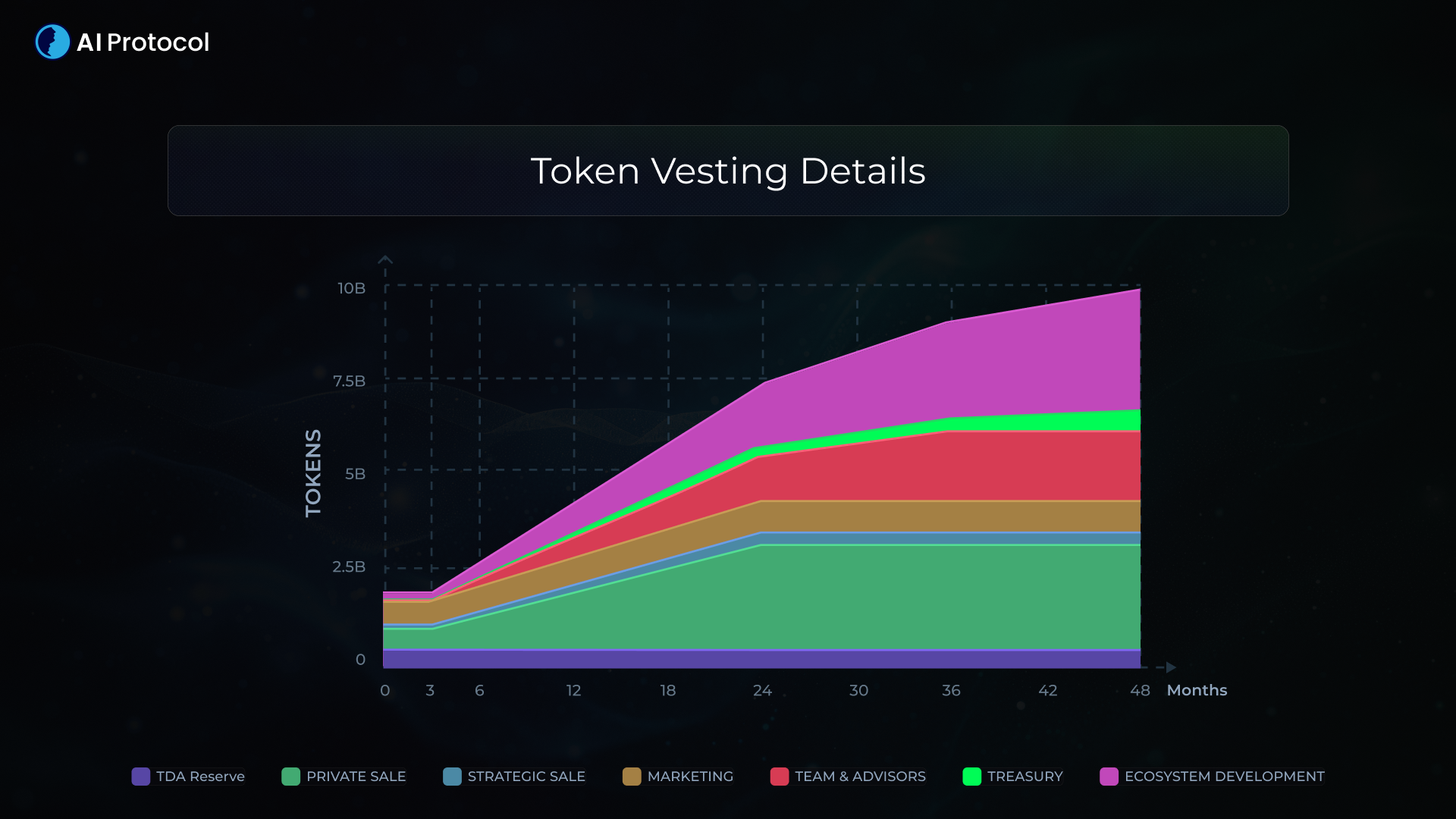 A stacked area chart of the Token Vesting is shown below, the tokens started vesting on Feb 14th, 2022 with an initial circulating amount of 7.9% (790 M) of the total supply: