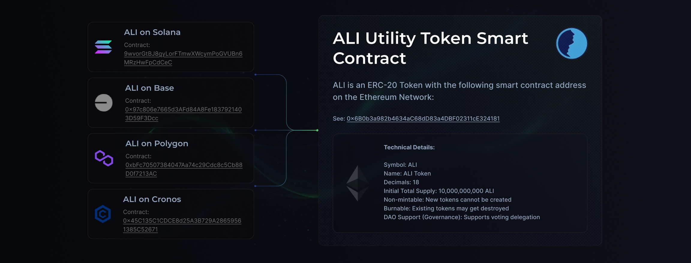 The native Artificial Liquid Intelligence (ALI) Utility Token is central to the AI Protocol’s decentralized operations, governance, and growth. Blockchain-agnostic and versatile, ALI facilitates asset creation, liquidity provisioning, staking, and transactions. It enables access to AI services, powers governance and reward mechanisms, and serves as a reserve asset backing upgrades to intelligence assets across the ecosystem.