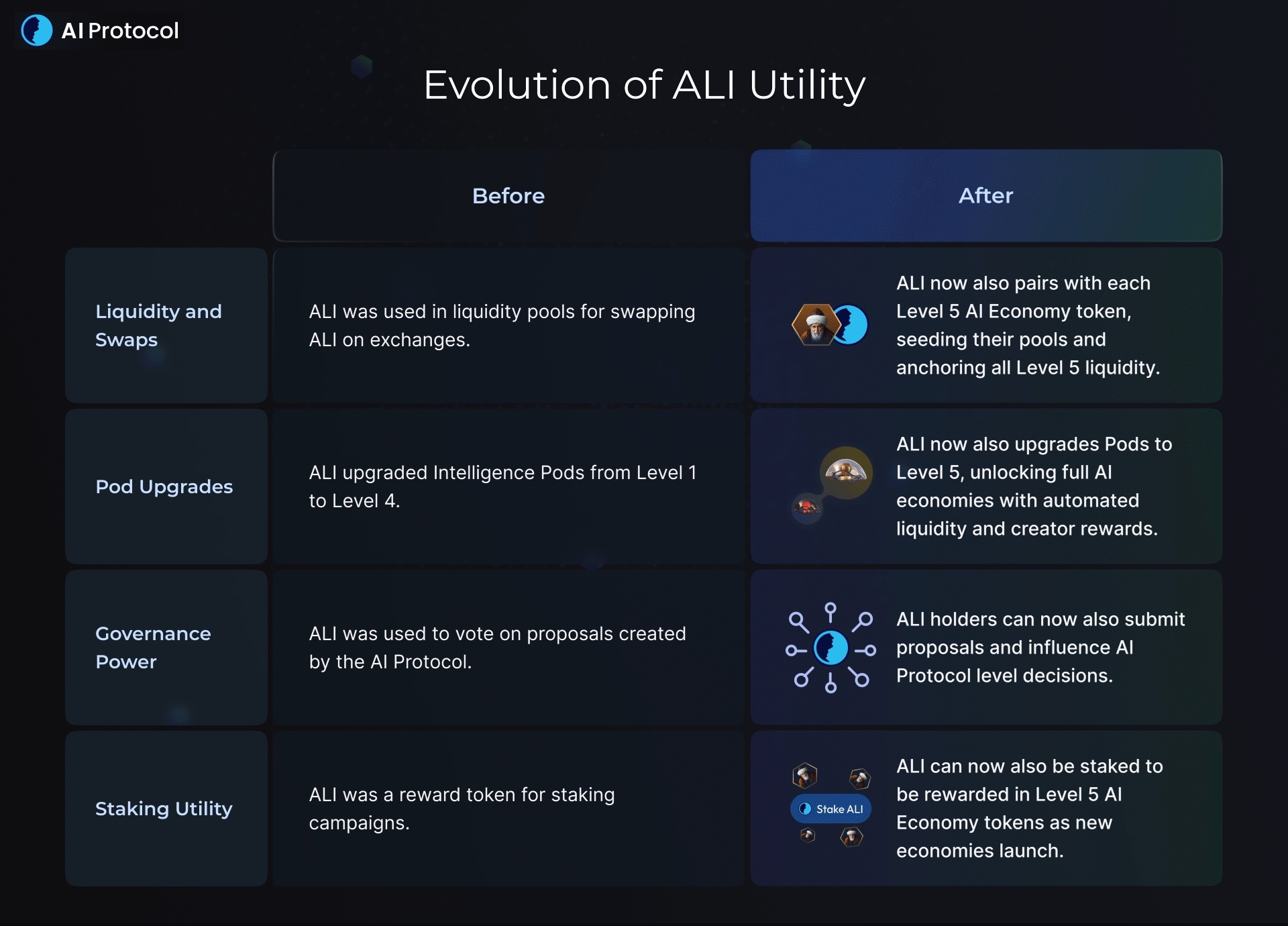 Finally, ALI also functions as a reserve asset across the ecosystem, backing upgrades to Intelligence assets across the network. As the AI Protocol evolves into v3, ALI will serve as the unit of exchange for credits, agent services, and intelligent interactions across various dApps.