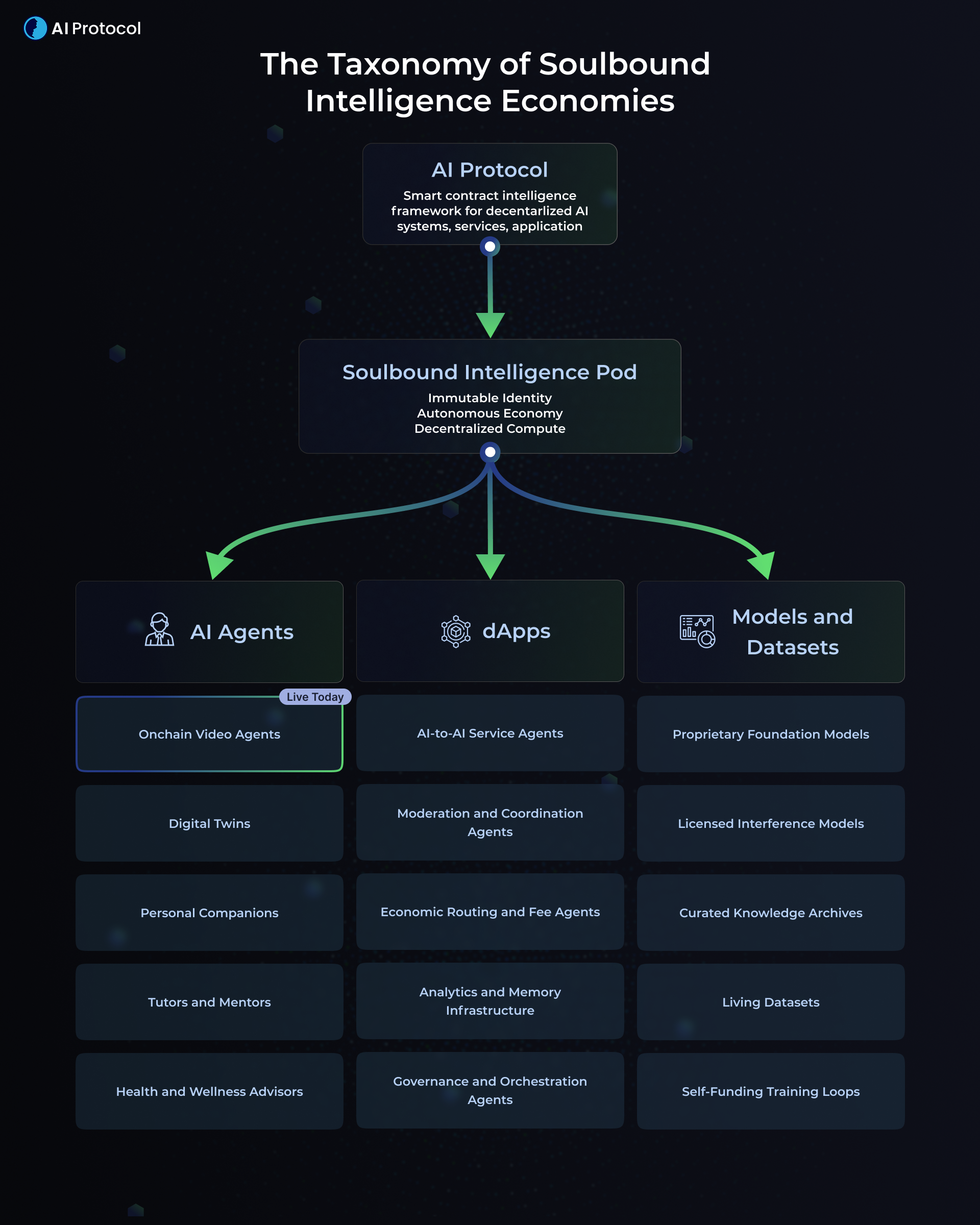 A Level 5 Intelligence Pod is not limited to a single asset type. It can fuse with three distinct classes of AI assets, each forming its own category of Soulbound Intelligence economy: