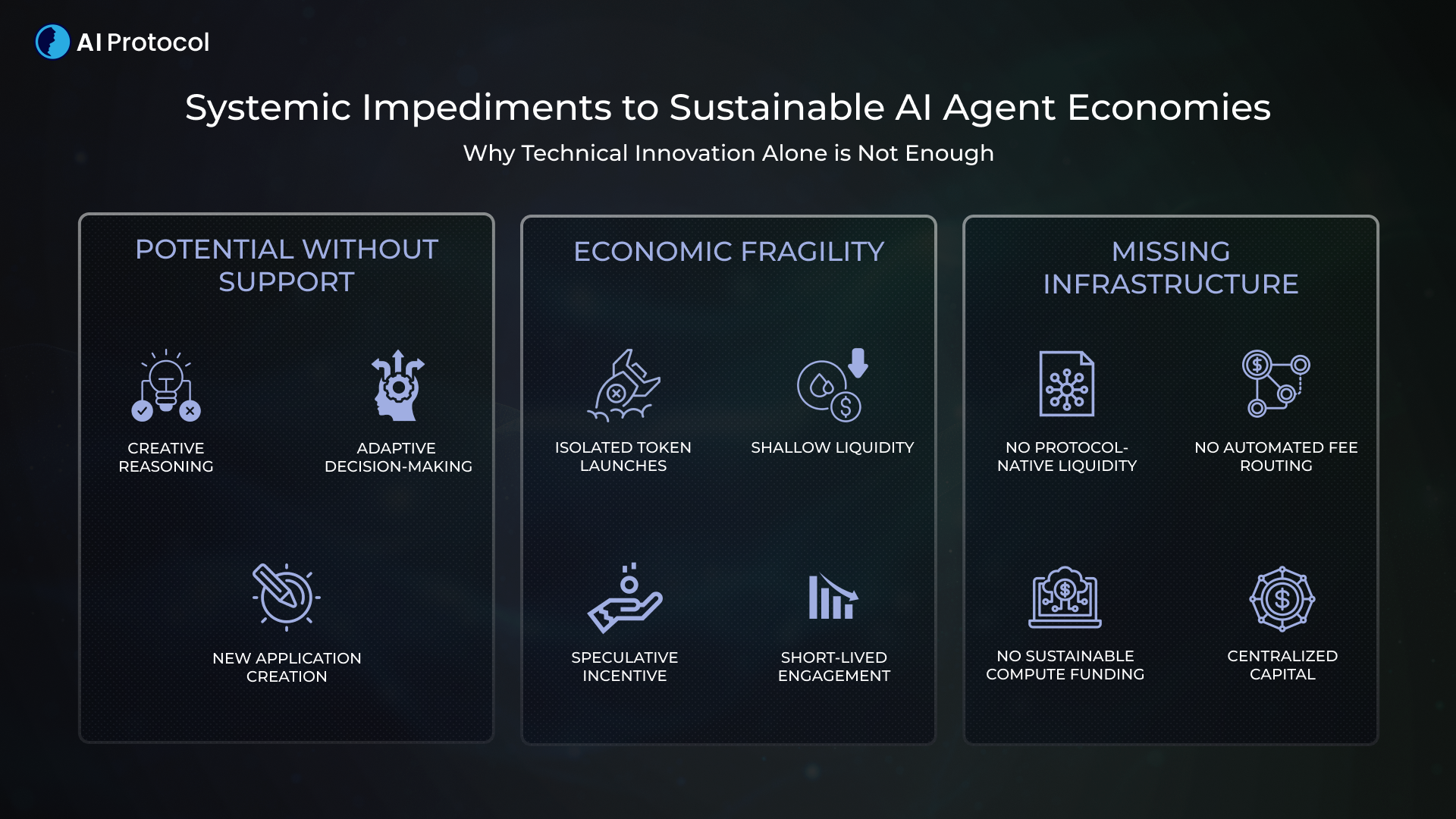 Without protocol-native mechanisms for liquidity provisioning, fee routing, and operational funding, AI assets cannot maintain enduring onchain economies. The lack of integrated financial and computational architecture has prevented intelligence from becoming a durable, composable public good.
