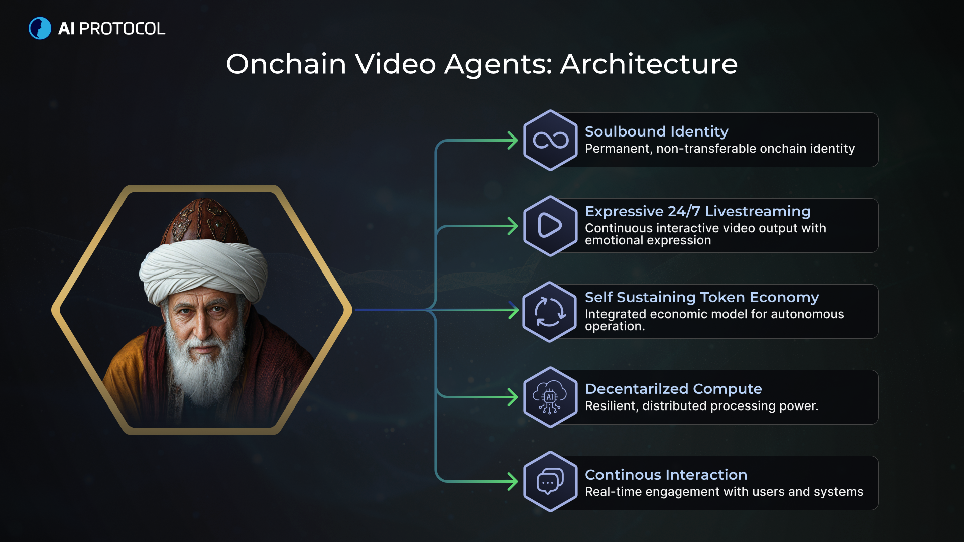 These agents operate as always-on entities that livestream, interact with users in real time, and generate content continuously. Their identity is permanently bound onchain, their execution is powered by decentralized compute, and their operation is sustained through protocol-native economic logic rather than centralized infrastructure.